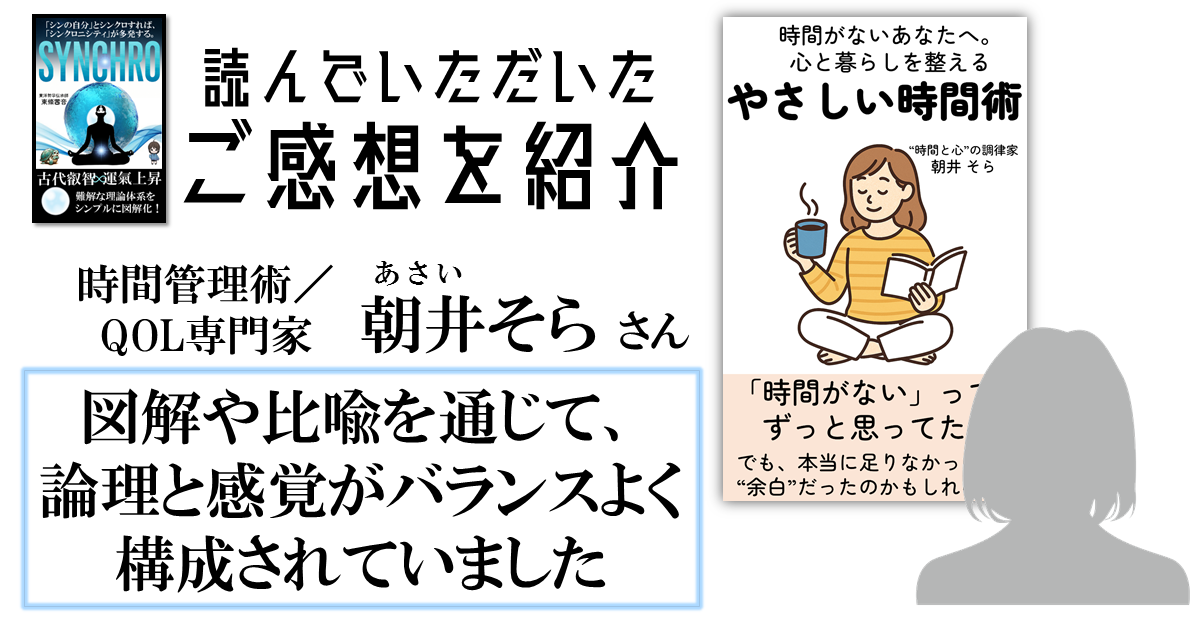今回は、時間管理術等のQOL専門家として活躍されている「朝井そら」さんに、『SYNCHRO』の先行モニターとして感想をお寄せいただきました。